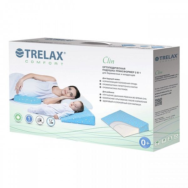 Подушка TRELAX CLIN имеет оптимальный угол наклона – 12 градусов. Расположение тела под таким наклоном обеспечивает комфорт и оказывает максимальный терапевтический эффект как для мамы, так и для ребенка.